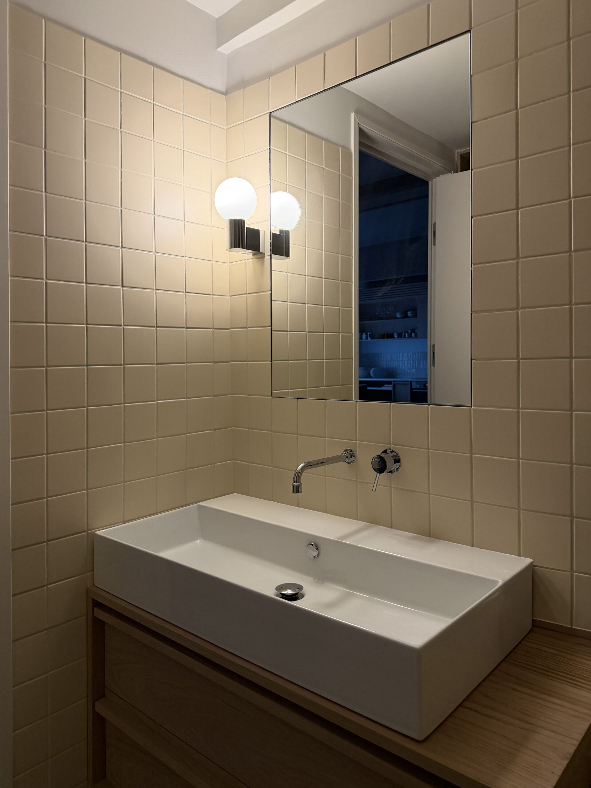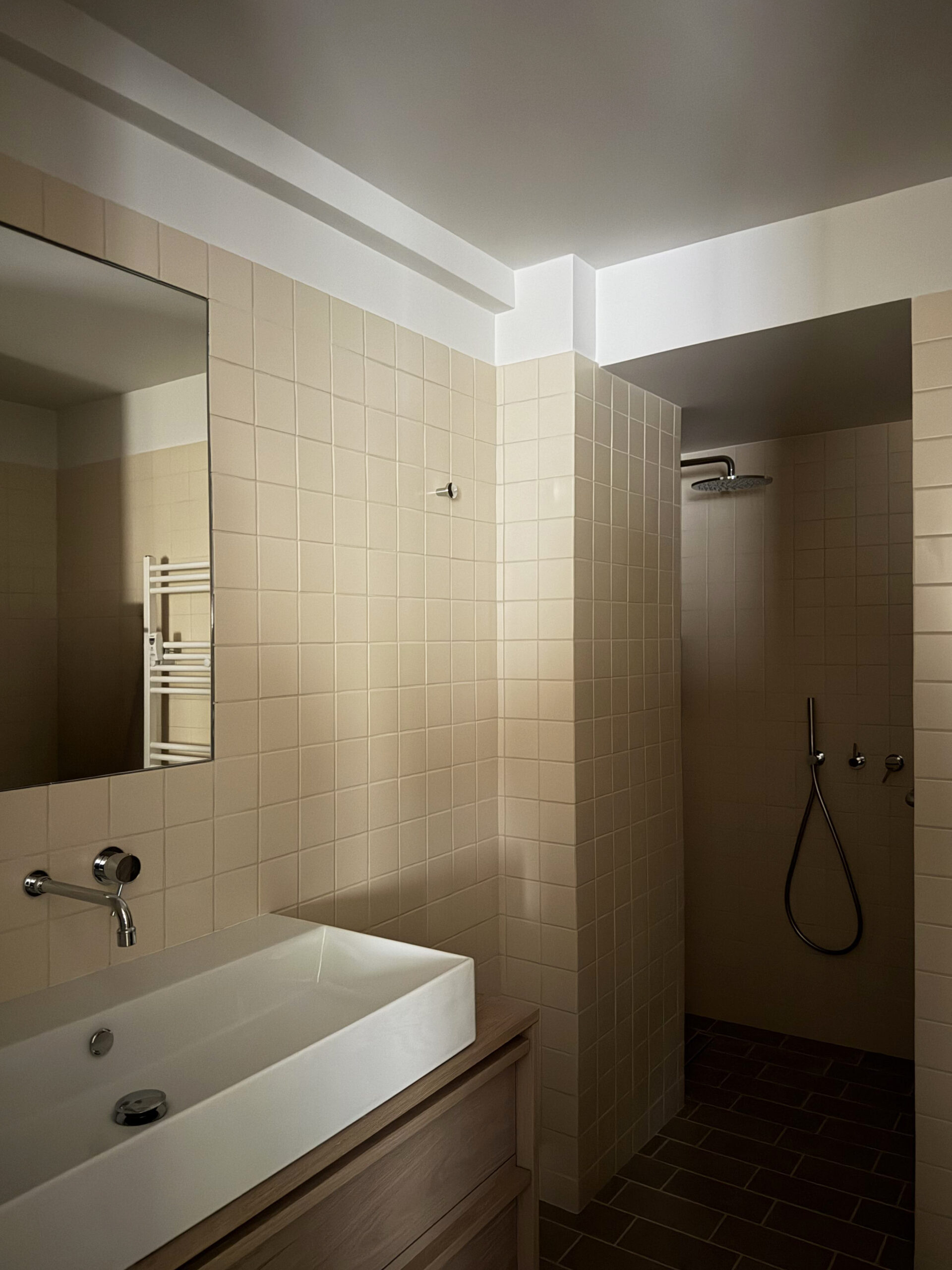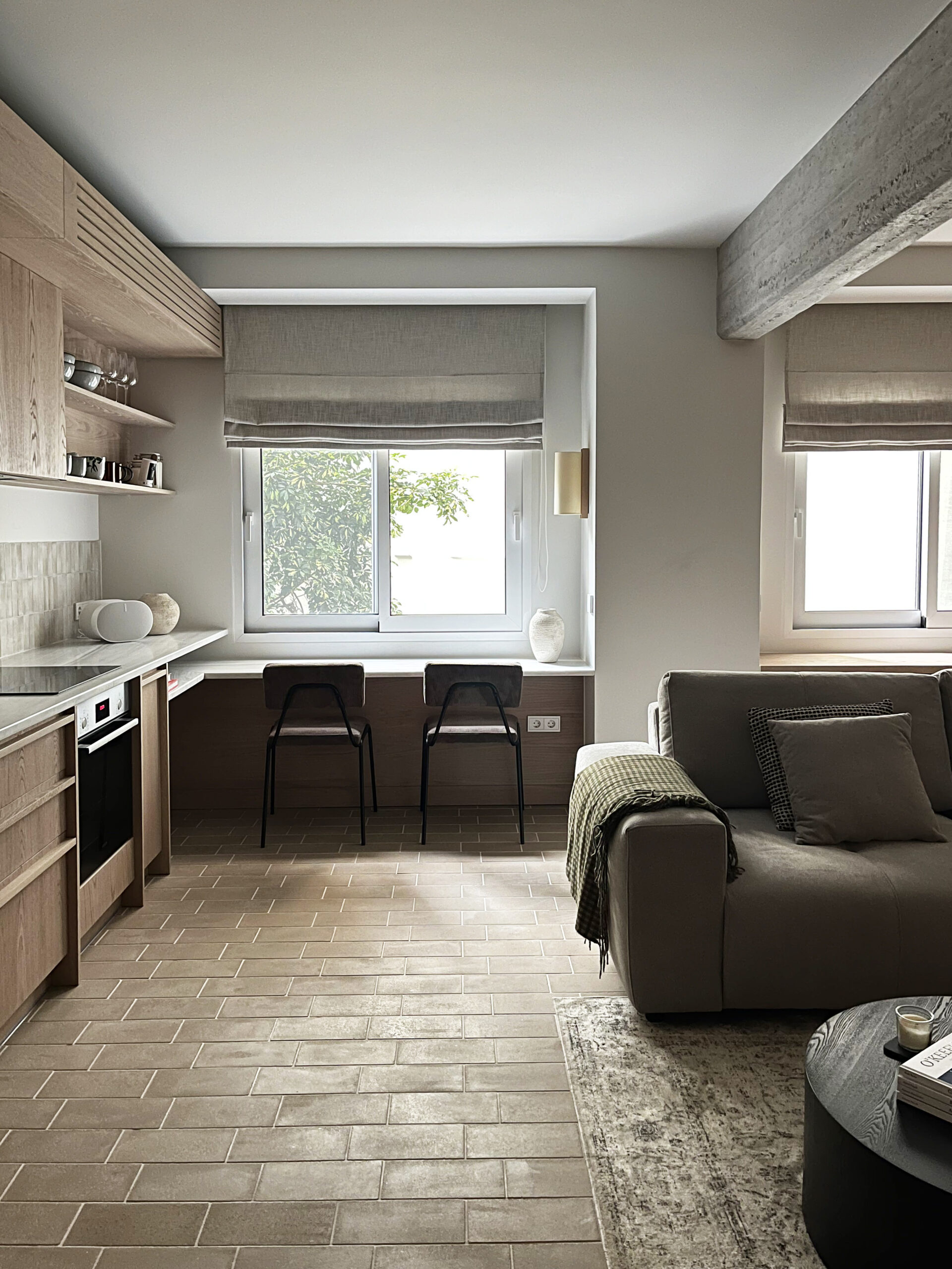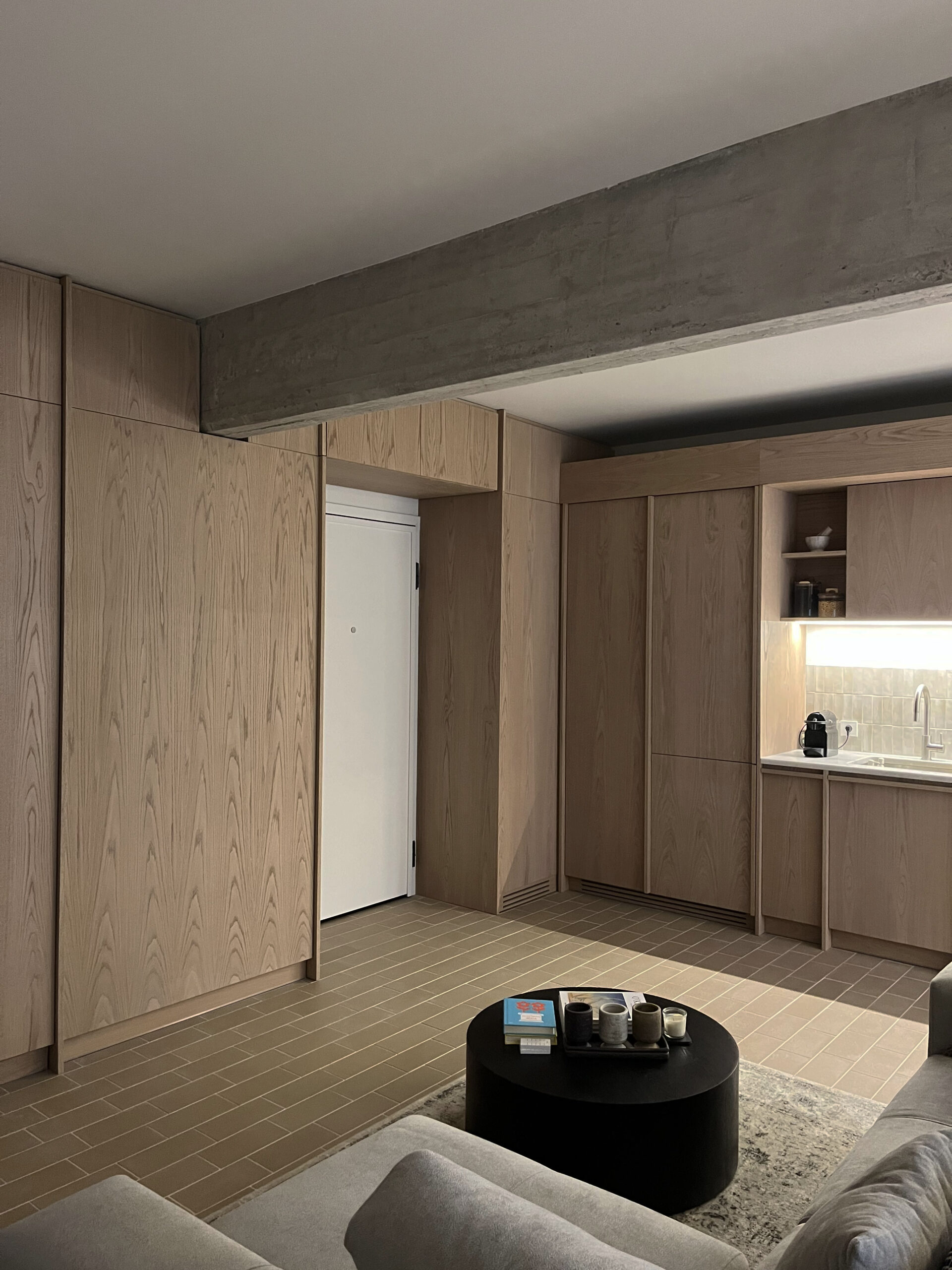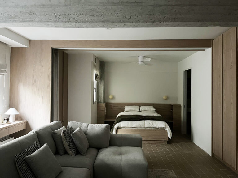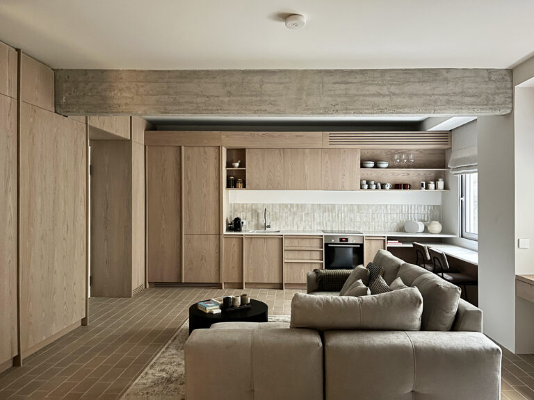 Set within the dense fabric of Kolonaki, this 47sqm apartment is a compact but highly articulated renovation in the heart of Athens. The project introduces a quiet rhythm to the space—an atmosphere of soft enclosure, crafted through a palette of warm wood, earthy terracotta floor tiles, and subdued textiles.