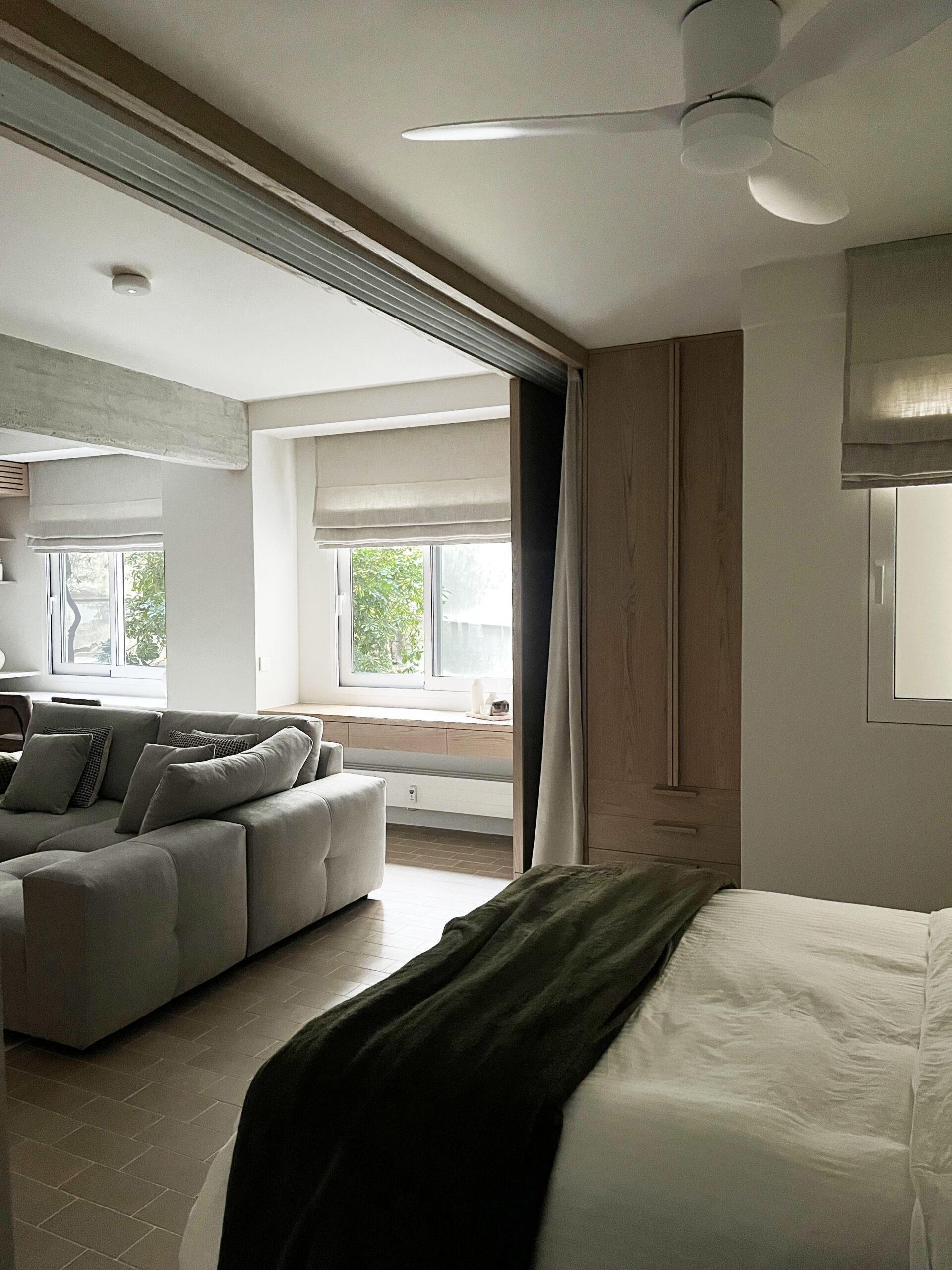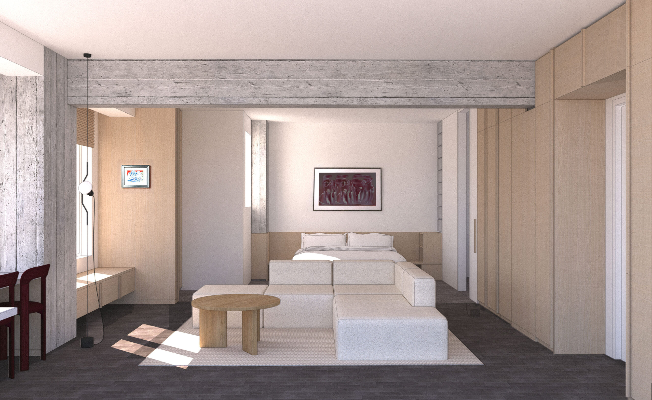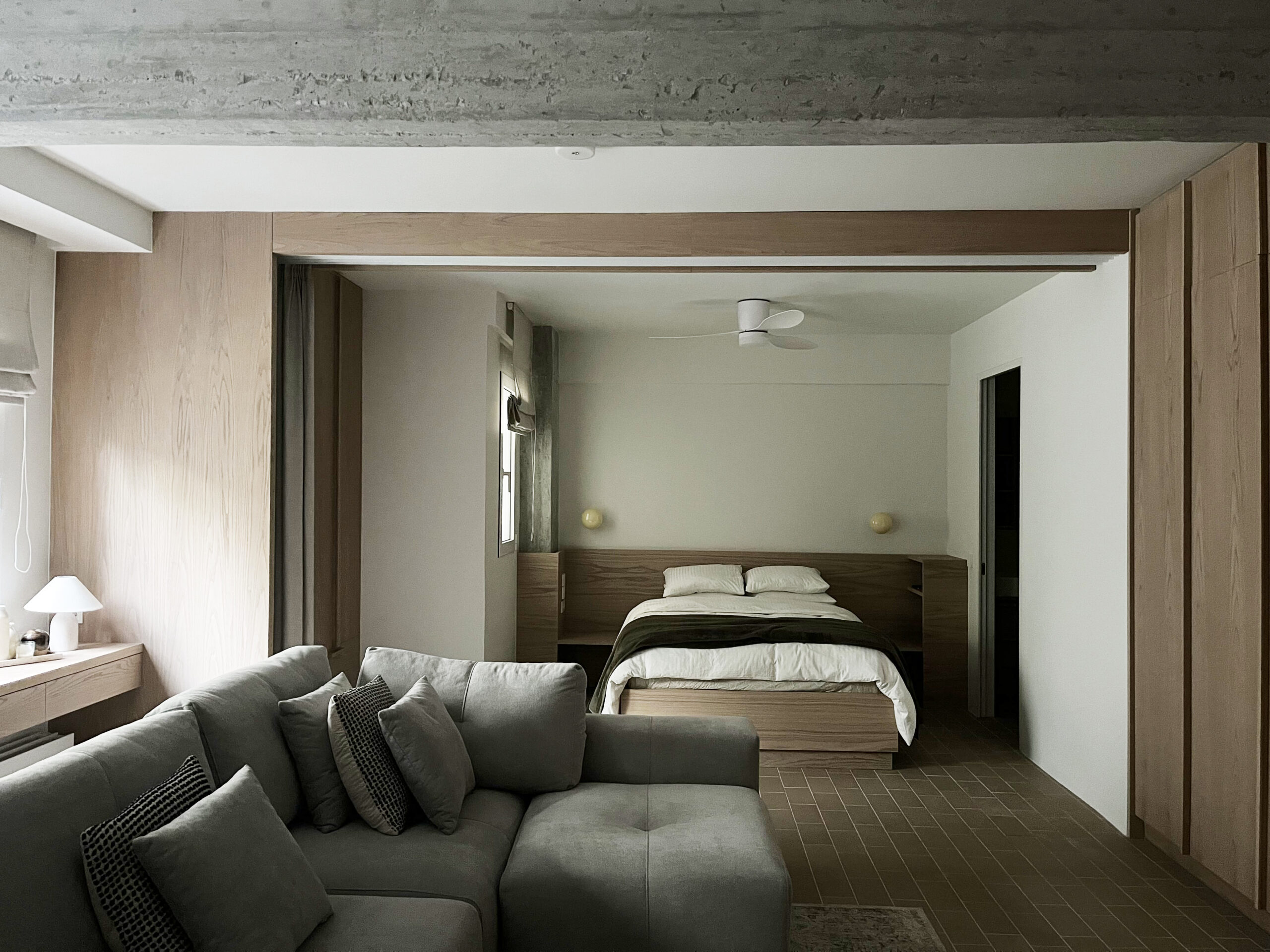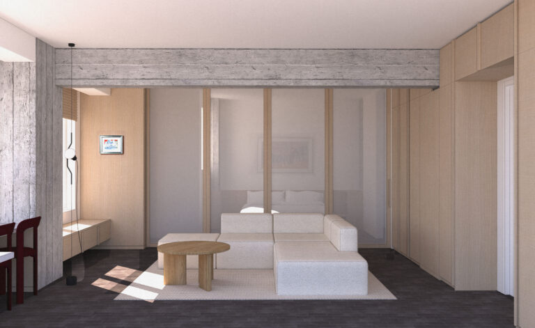 A translucent partition of timber-framed panels defines the boundary between living and sleeping zones, offering flexibility while maintaining a sense of openness. The low, modular sofa anchors the center of the plan, forming a threshold between the functions without interrupting the spatial flow.