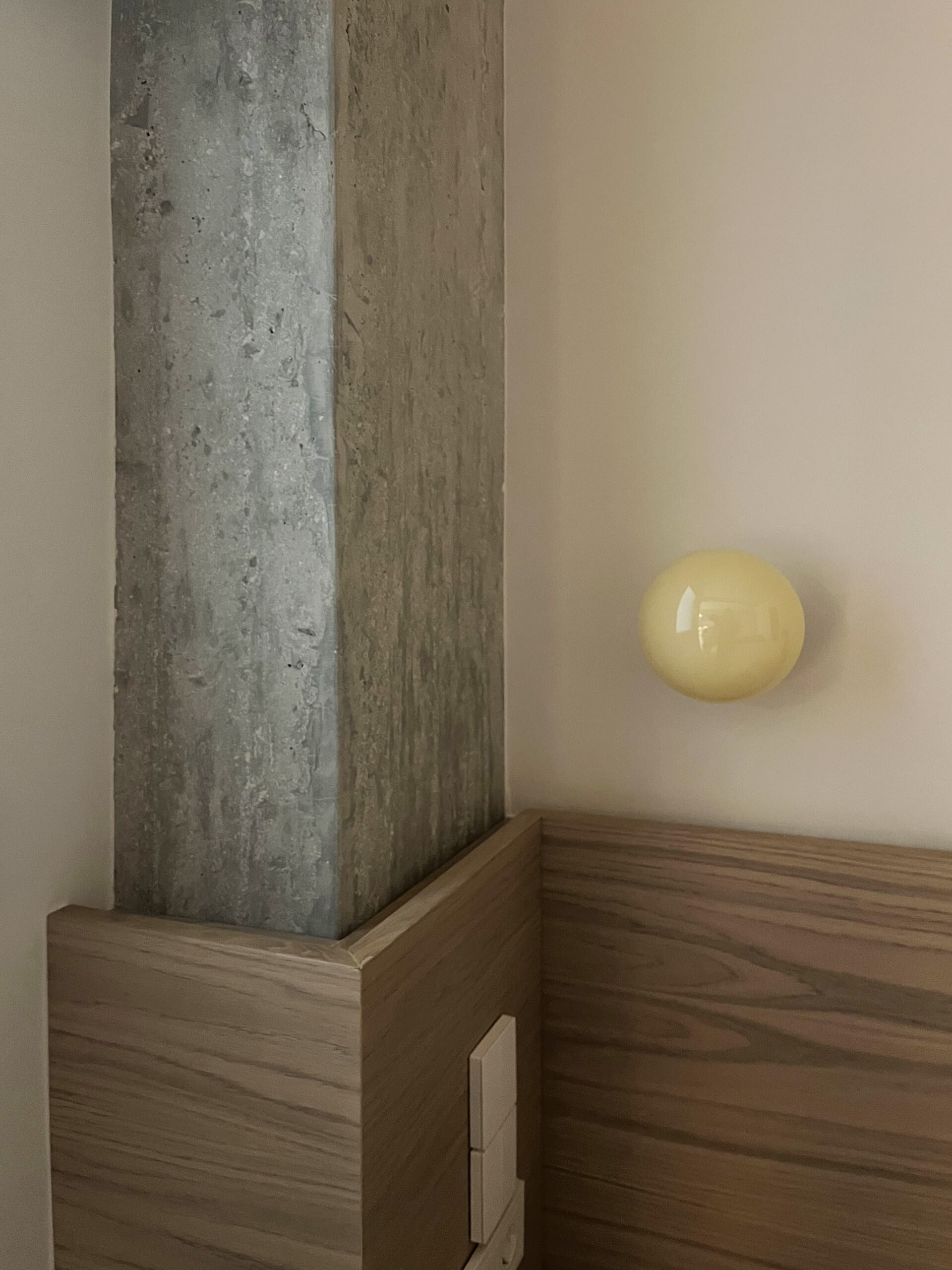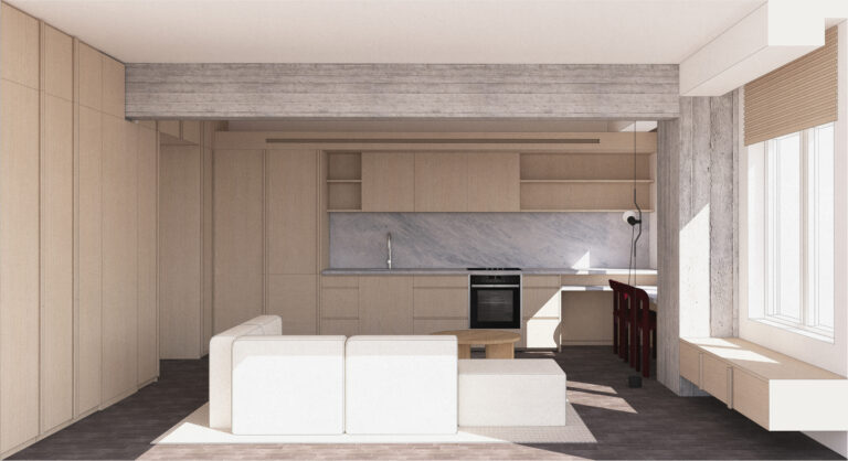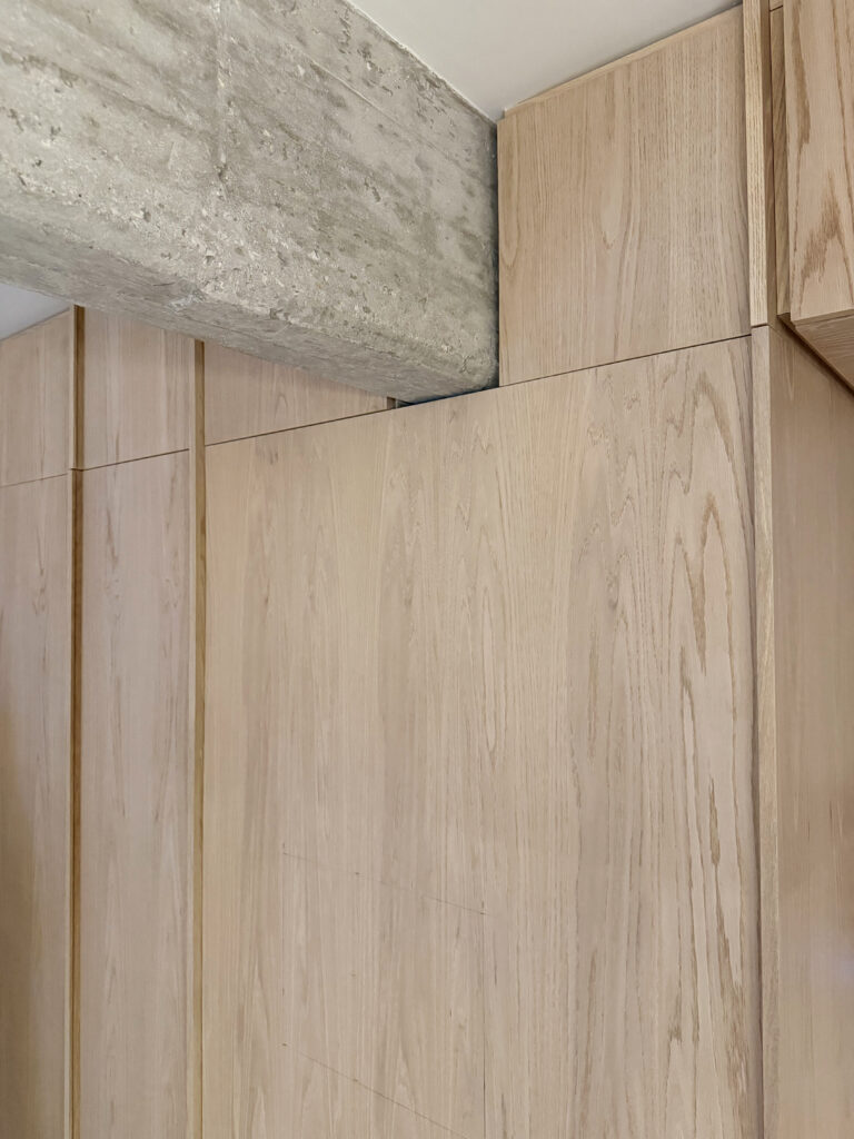 Pale oak millwork wraps the kitchen and storage surfaces in continuity, punctuated by marble with muted veining and raw concrete beams that lend a structural honesty. The interplay of smooth and tactile finishes is heightened by natural light, which moves across the textured surfaces throughout the day.